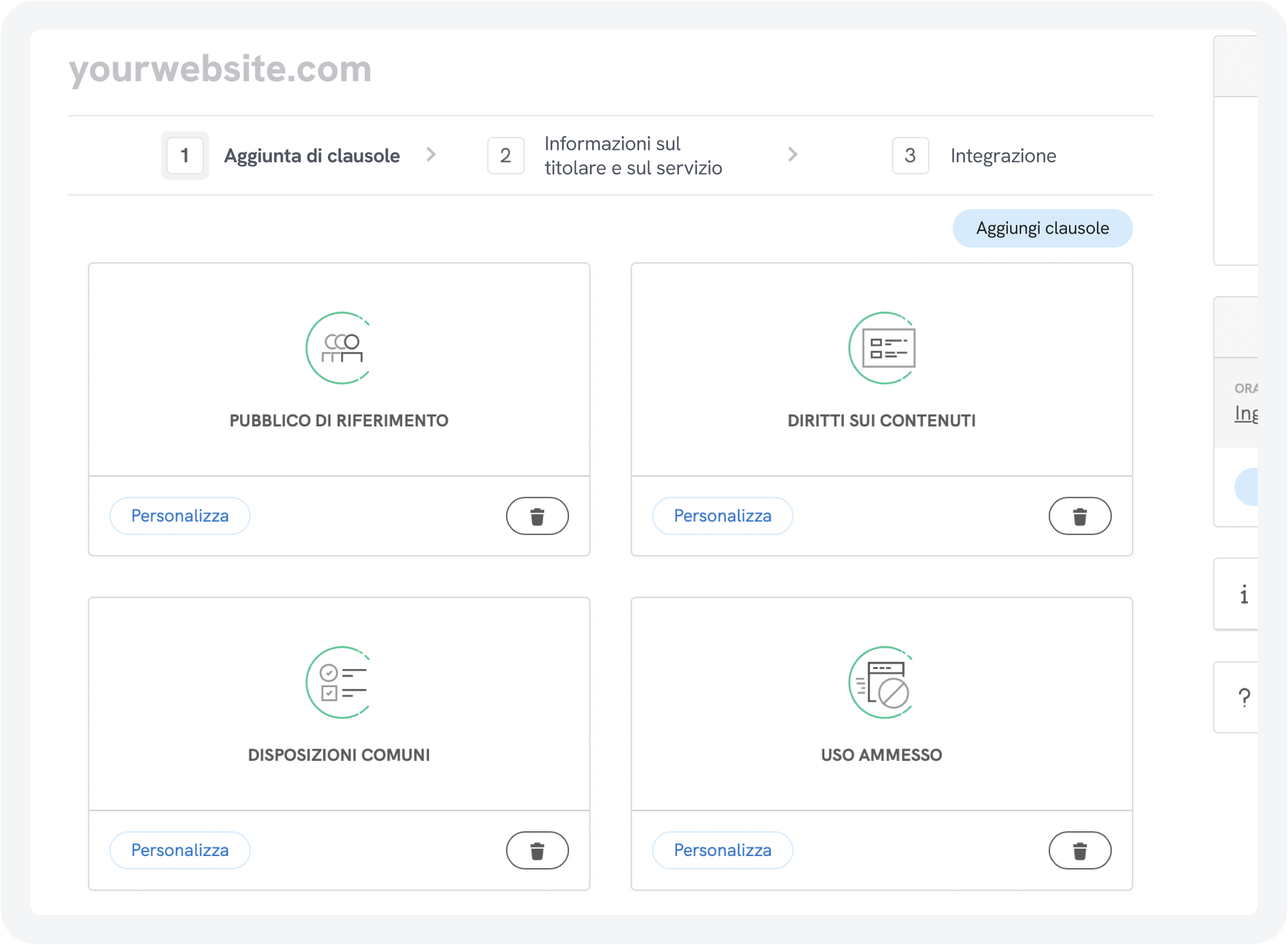 I nostri esperti legali scrivono le clausole e tu scegli quelle che servono per il tuo sito o app. Quando arrivano nuove leggi, il nostro team le aggiorna e i tuoi documenti restano sempre attuali.