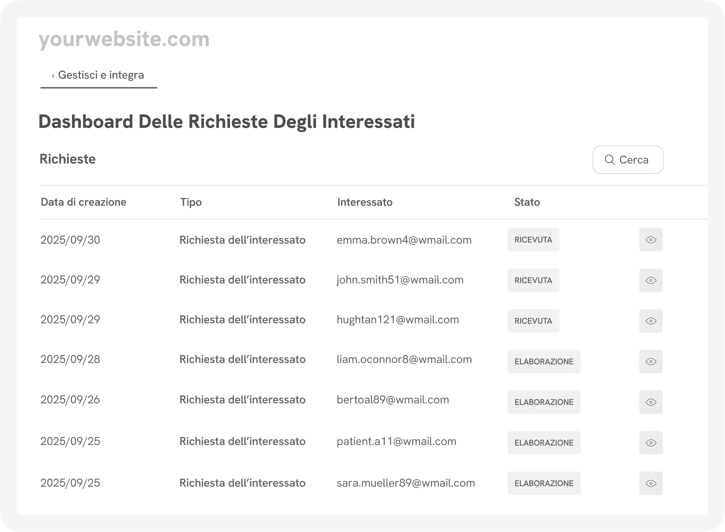 Accesso, cancellazione, rettifica, portabilità: tutto in un unico posto. Gestisci le richieste degli interessati senza perderti nella tua inbox. Log completi mostrano cosa è stato fatto e quando, con promemoria automatici per le scadenze.