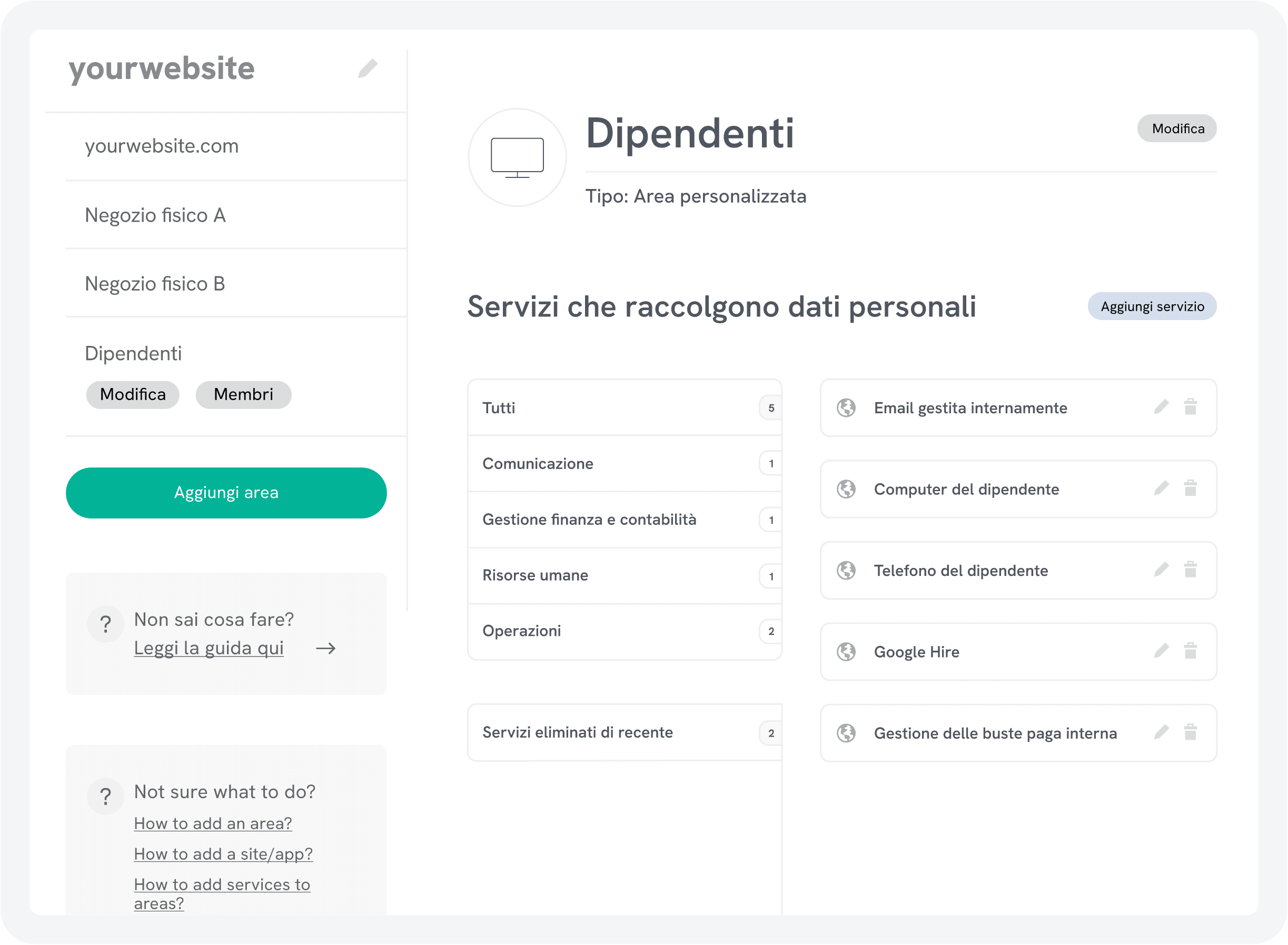 I requisiti dell’Articolo 30 non devono per forza diventare un incubo burocratico. Tieni traccia di politiche di conservazione e basi giuridiche per ogni attività, organizza per team o sede e assegna ruoli con responsabilità chiare.