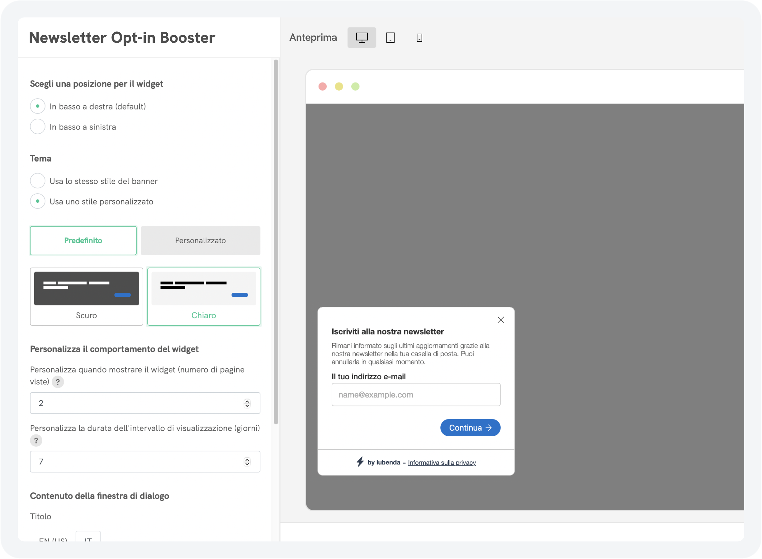 Raccogli iscritti con form in linea col tuo brand, double opt-in di default e consensi verificabili. Ogni preferenza viene salvata nel Consent Database ed è esportabile direttamente verso la tua piattaforma email.