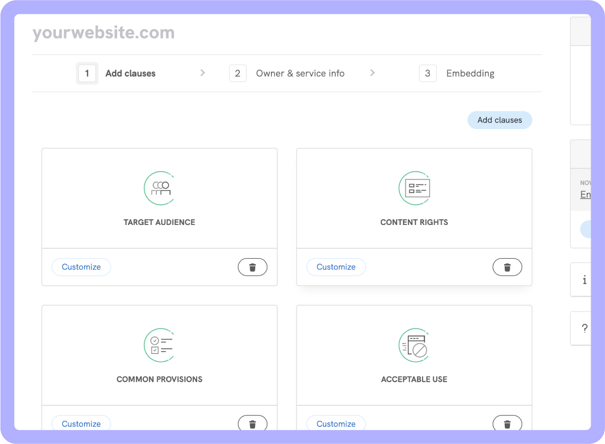 Nessun progetto è uguale all’altro, e nemmeno i Termini e Condizioni dovrebbero esserlo. Blog, e-commerce o SaaS: abbiamo qualsiasi clausola ti serva.