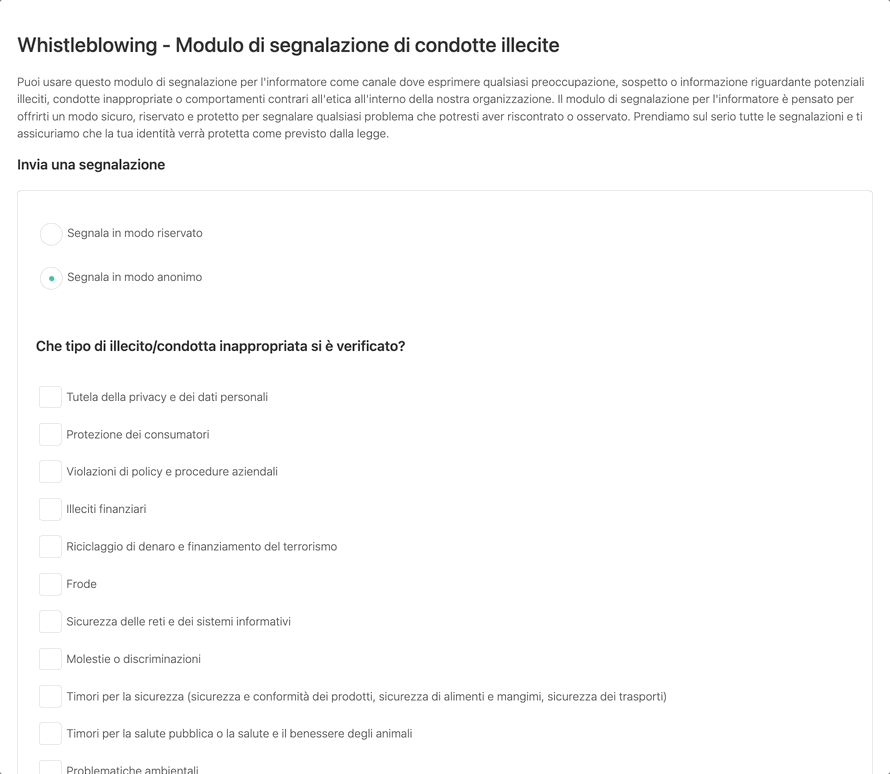 In questa sezione troverai il link diretto per integrare il modulo. Copialo e incollalo in modo strategico sul tuo sito, intranet, policy whistleblowing, od ovunque tu ne abbia bisogno.