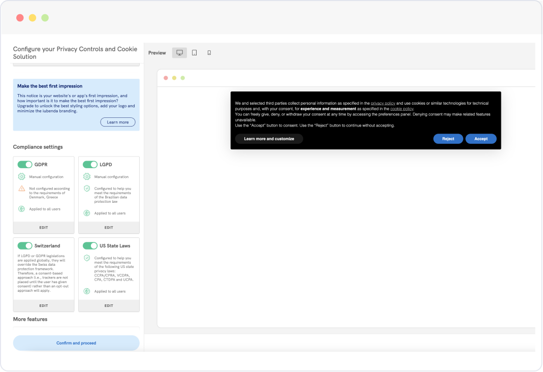 A differenza di altre soluzioni, con iubenda puoi eliminare qualsiasi riferimento al nostro marchio e avere una soluzione completamente personalizzata.