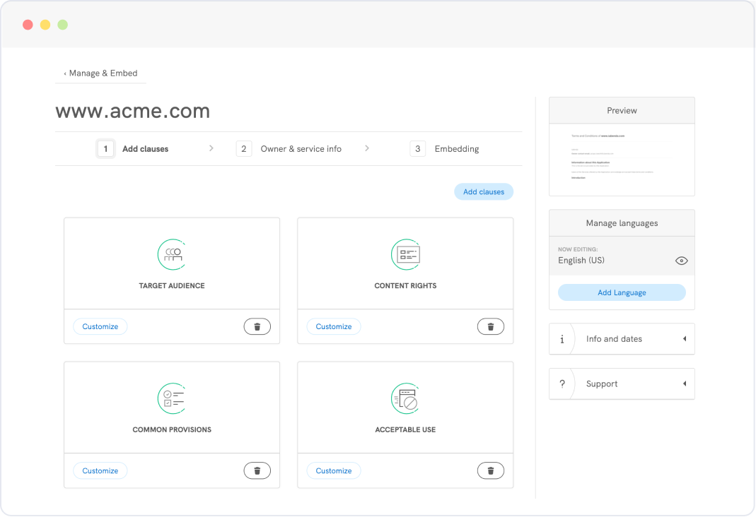 Genera e gestisci facilmente Termini e Condizioni professionali. Ottimizzato per e-commerce, marketplace, Saas, app e altro ancora.