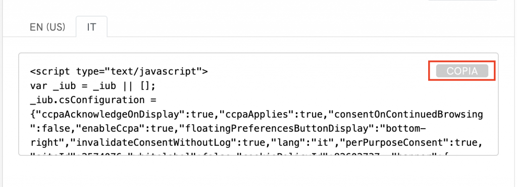 Qui puoi personalizzare e poi cliccare su copia per copiare la tua soluzione Privacy Controls and Cookie Solution.