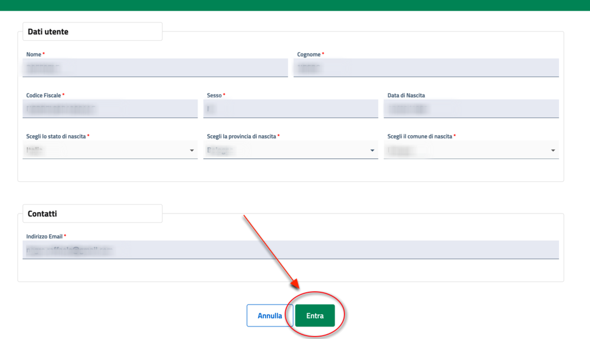 Una volta completata l’autenticazione, raggiungerai la pagina di conferma dei dati utente. Verifica che i dati siano corretti e clicca su “Entra” per procedere.