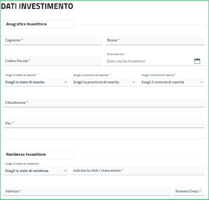 Nella schermata successiva, denominata “Dati investimento” dovrai inserire i dati del beneficiario dell’agevolazione (il singolo investitore).