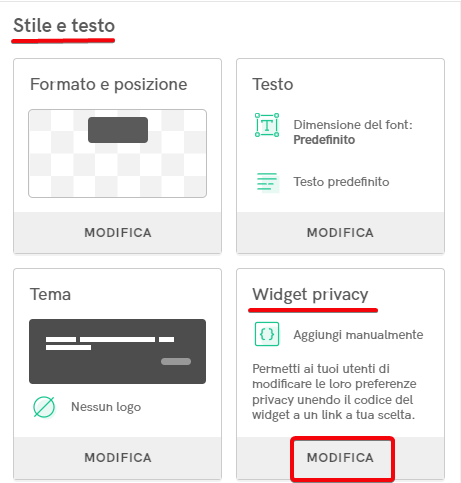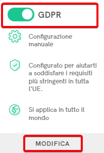 1) All’interno del configuratore di Privacy Controls and Cookie Solution, seleziona la sezione per l’adeguamento al GDPR e clicca su “Modifica”