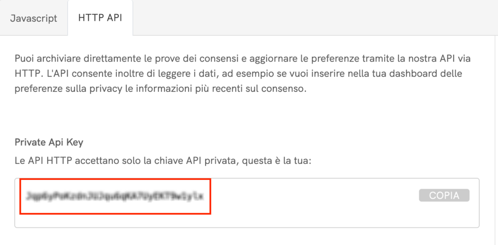 L’autenticazione di Make richiede di fornire la chiave API privata di iubenda, disponibile nella sezione HTTP delle opzioni d’integrazione del Consent Database.