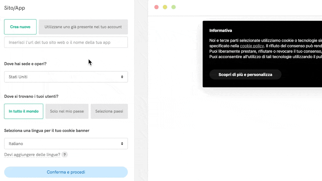 Dove hai sede? Dove si trovano i tuoi utenti? Rispondi a queste due semplici domande e ti suggeriremo la configurazione migliore per il tuo sito/app. Puoi scegliere se utilizzare la nostra configurazione automatica, o configurare manualmente, come preferisci.