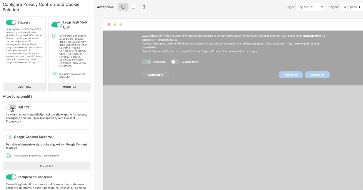 💡 In qualità di CMP certificata, abbiamo integrato il lo standard europeo di settore TCF di IAB e il Compliance Framework delle leggi degli Stati Uniti nella nostra Privacy Controls and Cookie Solution per aiutare i publisher a rispettare sia i requisiti di legge che gli standard di settore, massimizzando al contempo gli introiti pubblicitari.