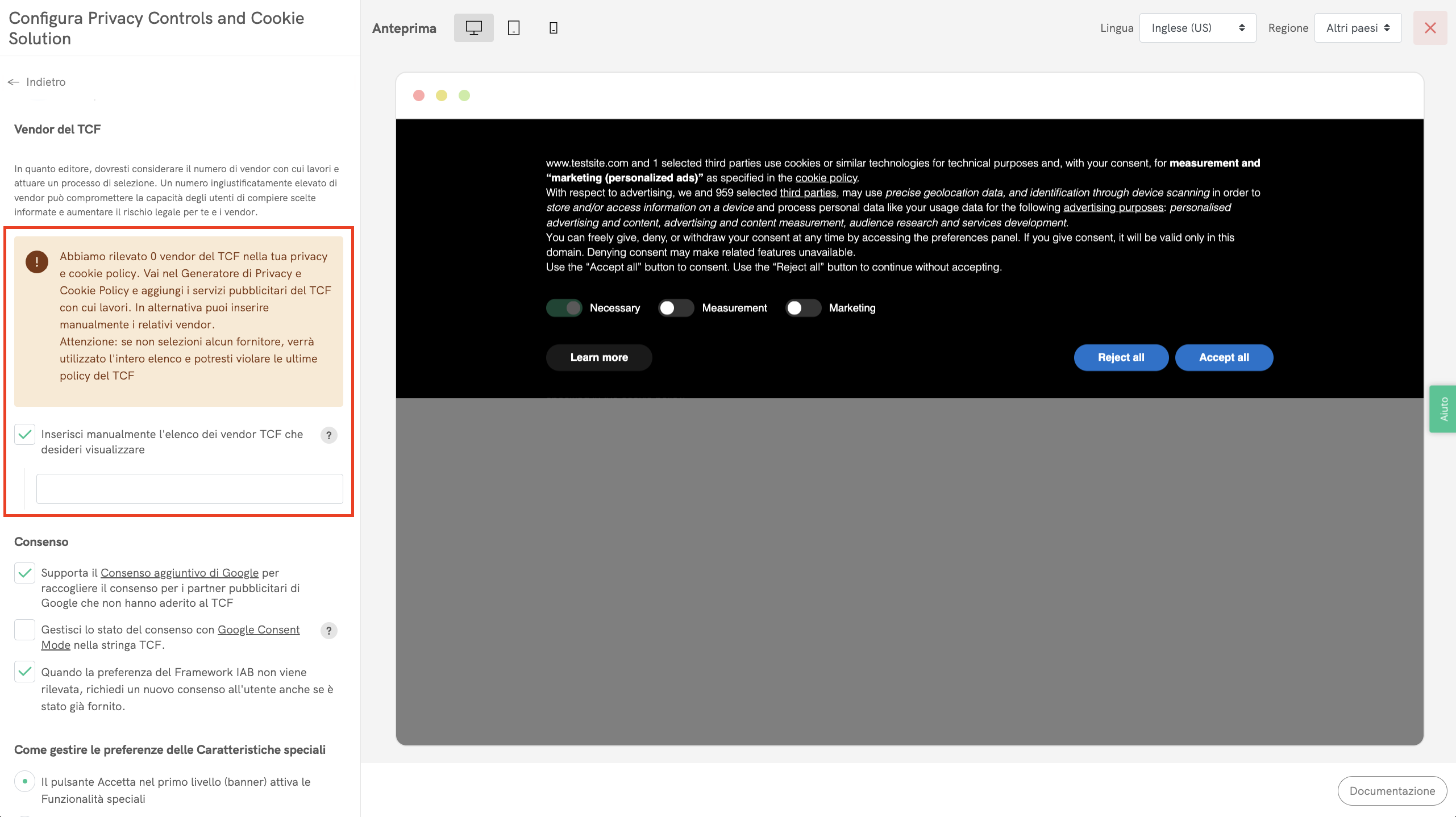 - Seleziona i vendor correlati al TCF dalla finestra modale dei servizi.