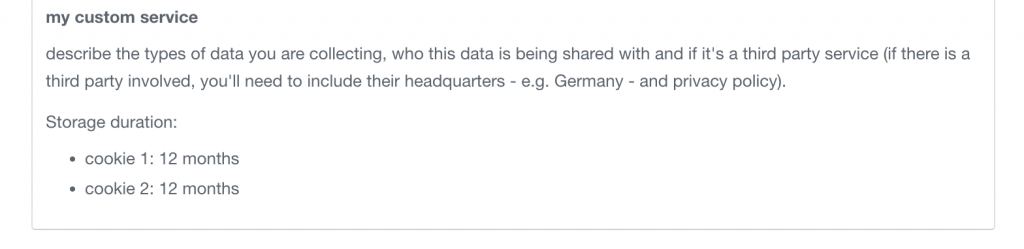 OPMERKING: om ervoor te zorgen dat de cookie-levensduur zichtbaar is, moet je in het bovenstaande punt hebben geselecteerd dat de dienst wordt weergegeven in het cookiebeleid of beide.