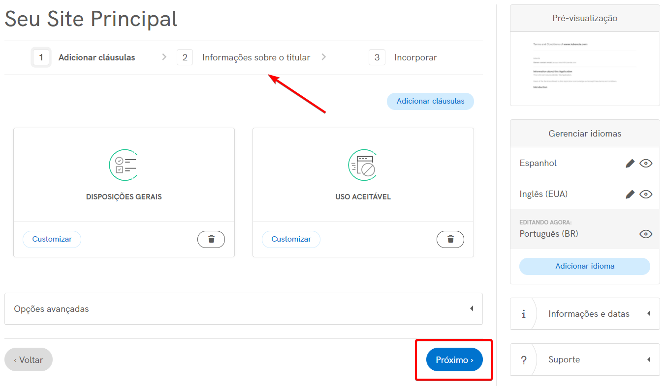 Agora que você terminou de editar, você terá que inserir os dados de sua empresa no campo Informações sobre o titular. Para fazer isto, basta clicar no botão Próximo na parte inferior direita da tela.