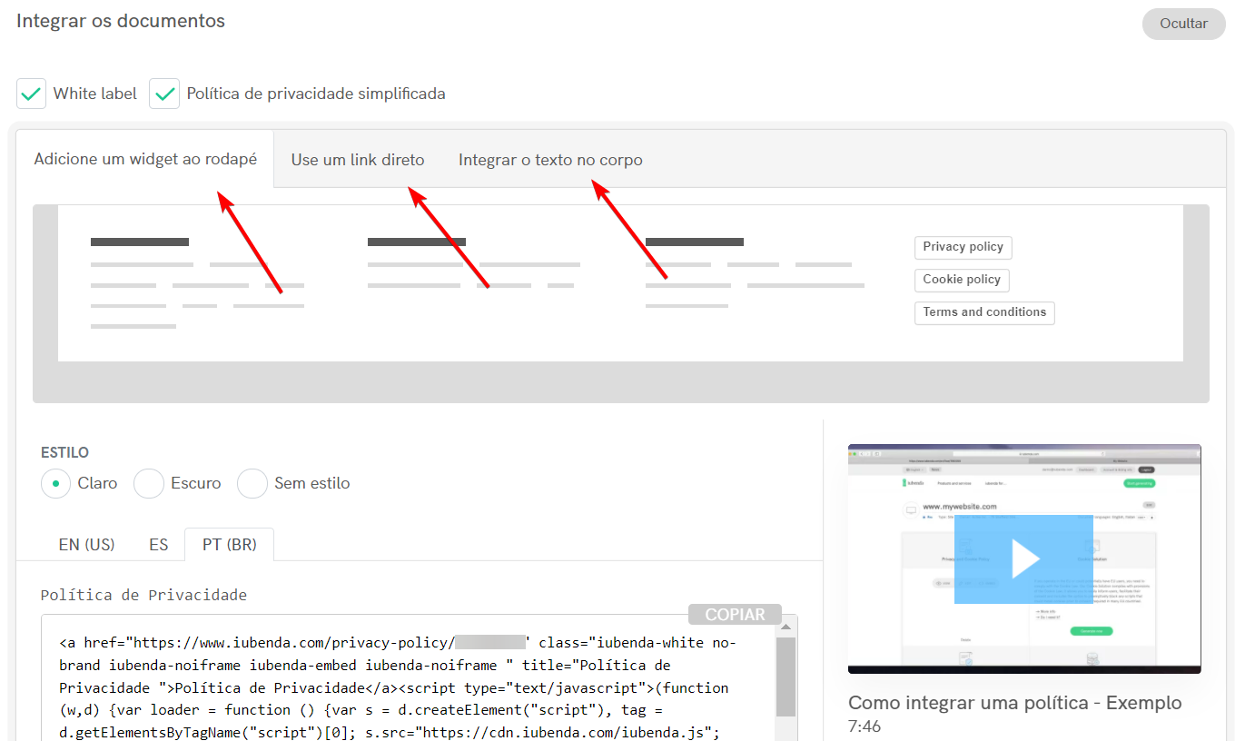 Para acessar qualquer um desses métodos, basta clicar na respectiva aba (se você já tem uma política de privacidade ativa no site, você terá que rolar a tela até a seção Termos e Condições), copiar o trecho do código ou link de texto, dependendo de seu método escolhido no botão de guia acima.
