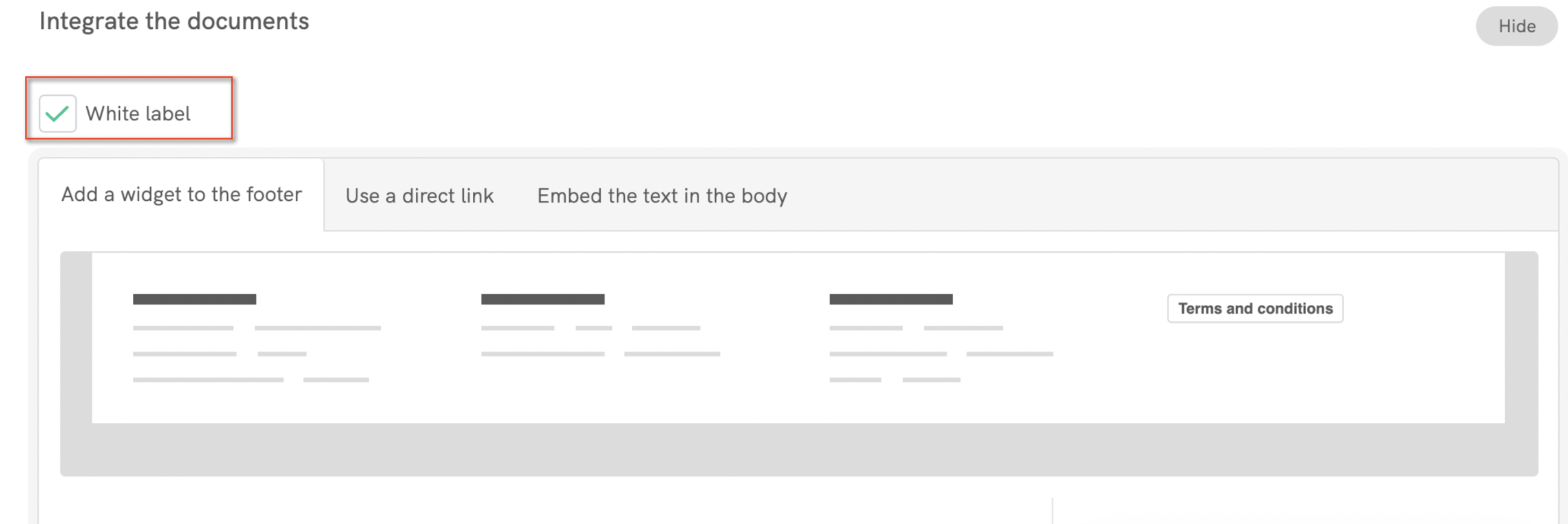 Copiar o código diretamente ainda aplicará o estilo iubenda (fontes, etc.) ao seu documento. Se desejar que o estilo do documento seja diretamente do seu site, selecione a opção de etiqueta em branco aqui.