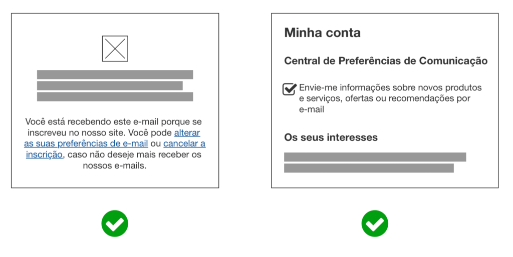 Uma mensagem de permissão apropriada é algo como: “Você está recebendo este e-mail porque é um cliente ou se inscreveu por meio de nossa [fonte]”.