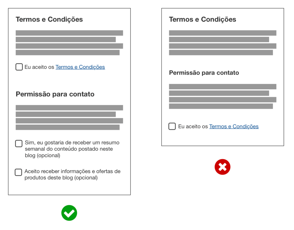 Por exemplo, nunca agrupe o consentimento com seus termos e condições: concordar com os termos e condições e dar consentimento para várias atividades (como assinar um boletim informativo) não são a mesma coisa. Torne-os facilmente distinguíveis uns dos outros e forneça opt-ins individuais para consentimento.