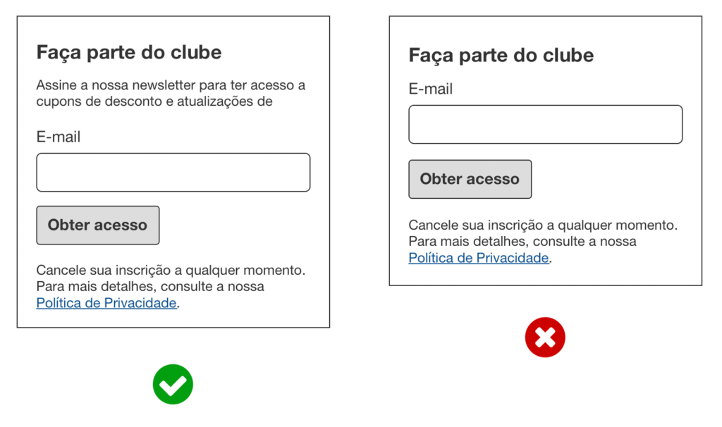 Num cenário em que o seu site tem uma janela pop-up que convida os usuários a se inscreverem na sua newsletter usando uma frase clara como: