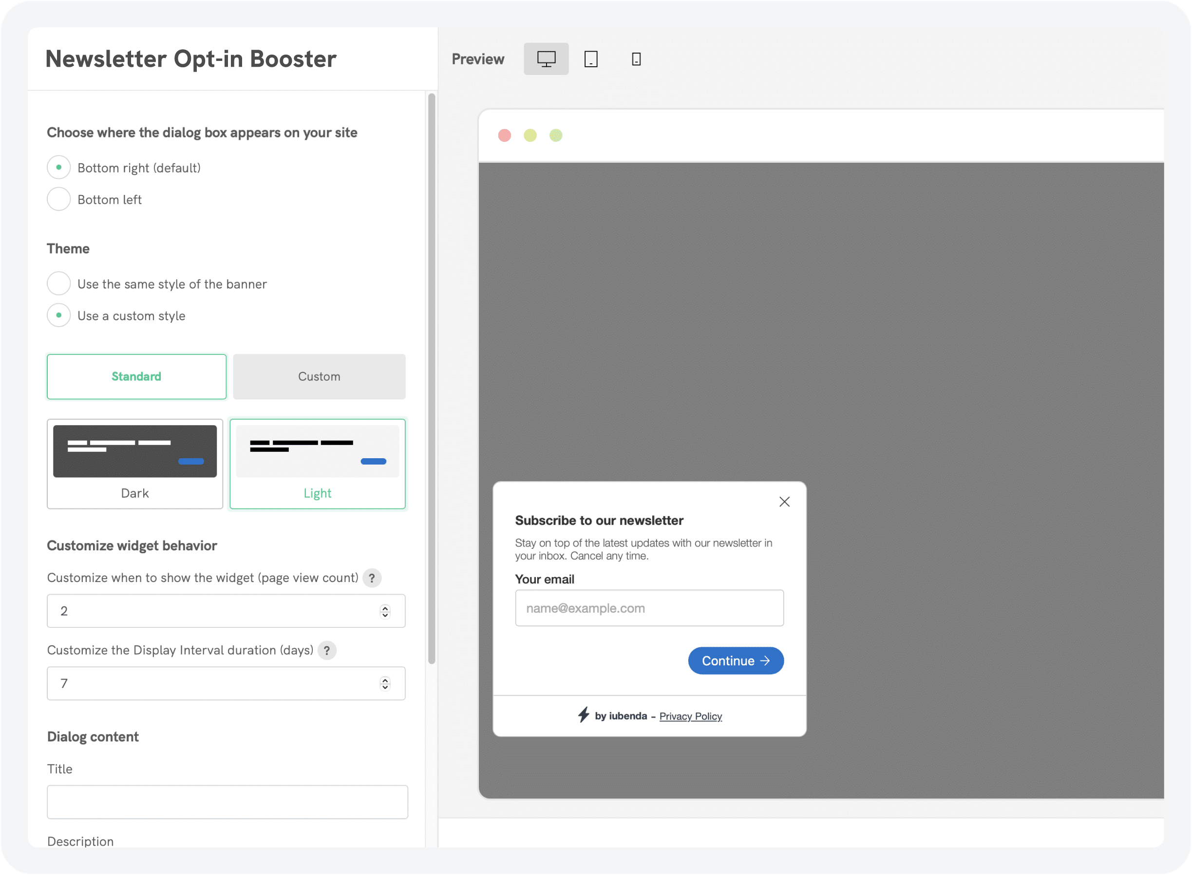 Mantenha todas as preferências conectadas. As atualizações fluem automaticamente em seu site, CRM e ferramentas de e-mail. Cada ação é registrada com um registro de data e hora e vinculada ao aviso legal correto, para que você tenha sempre uma prova à mão.