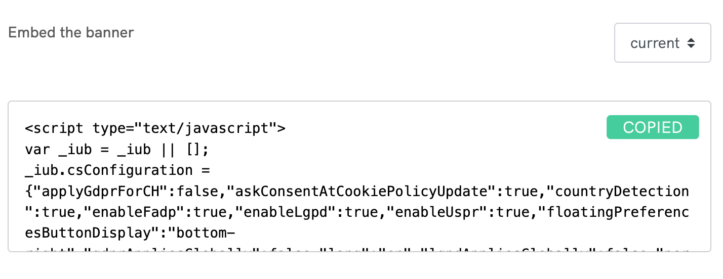 Incorporar é tão simples quanto copiar e colar um snippet de código HTML em seu site. Seu banner de consentimento de cookies e a integração do Google Consent Mode estão prontos para uso. Você também pode escolher outras opções de incorporação, como nossos plug-ins ou modelo do Google Tag Manager.