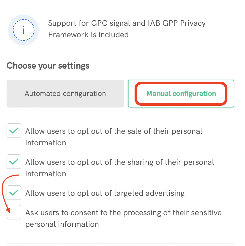 Em seguida, clique em Configuração manuale selecione Solicitar aos usuários o consentimento para o processamento de suas informações pessoais sensíveis.