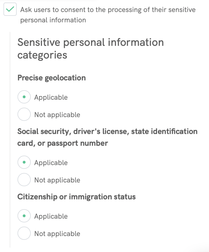 ⚠️ Observe que: nossa solução atualmente oferece suporte a três categorias de informações pessoais sensíveis (serão mais em breve). Caso você tenha indicado outras categorias além destas três em sua Política de Privacidade, no momento, não será possível administrá-las através da Privacy Controls and Cookie Solution.