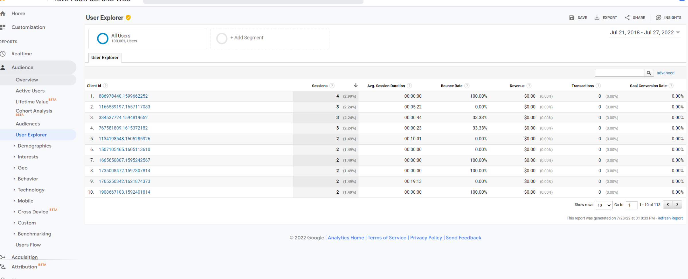 Filtre pelo código de ID do cliente que você recebeu (por exemplo, 1908667103.1592401814). Você também pode usar outros filtros (IP, data/hora para uma identificação mais precisa).