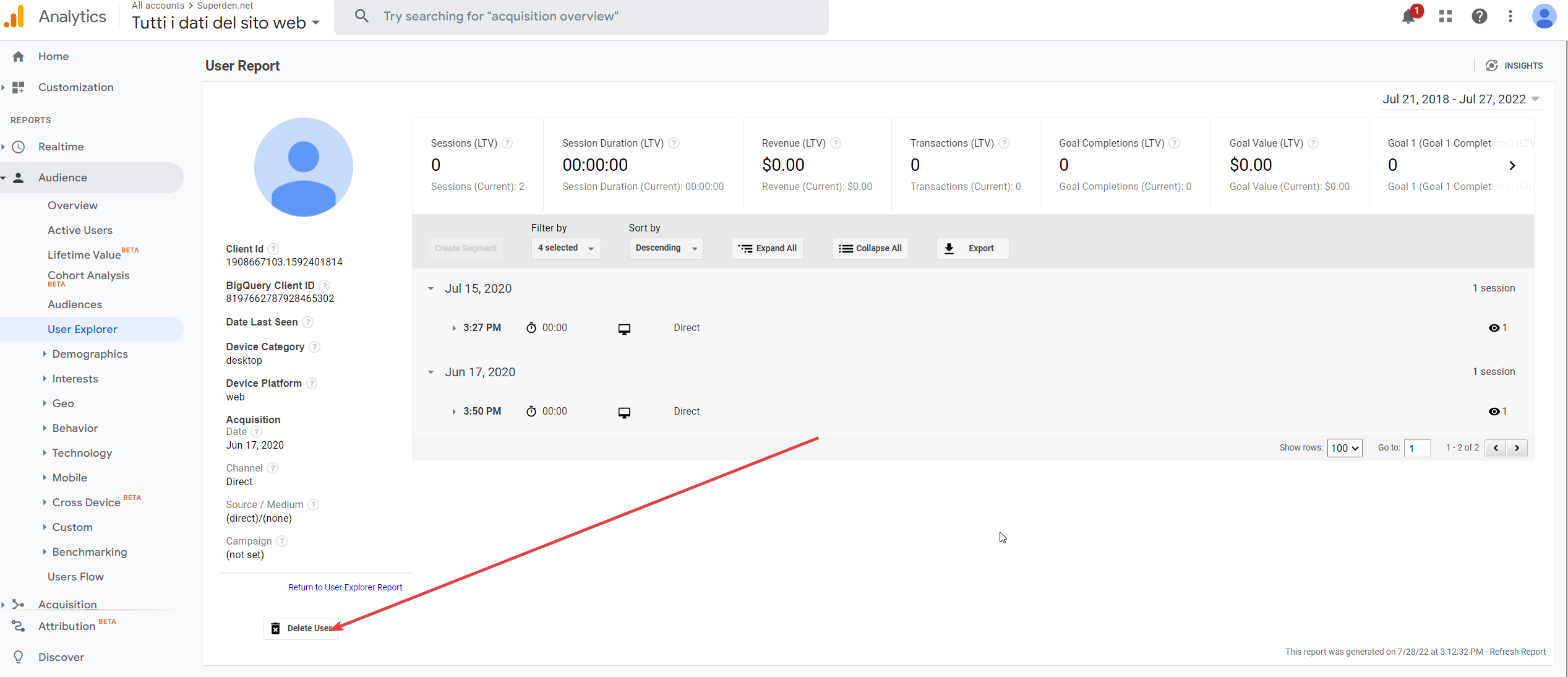 Clique no ID do cliente filtrado e clique no Delete user usuário encontrado na parte inferior da página.