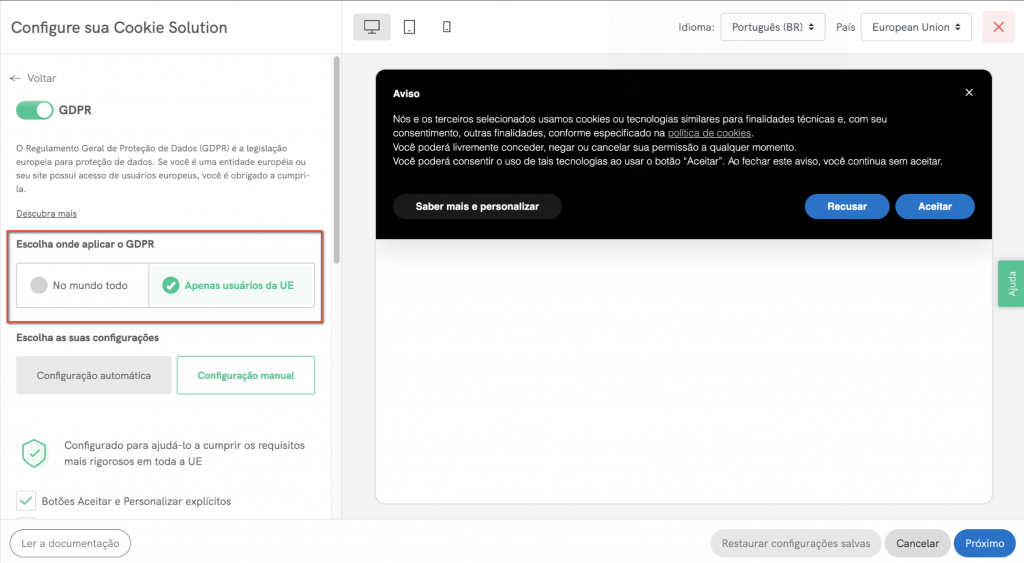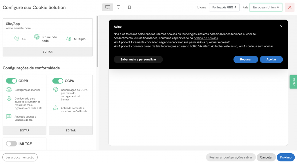 Você será imediatamente direcionado para o dashboard de configuração do seu banner de cookies/banner de consentimento: