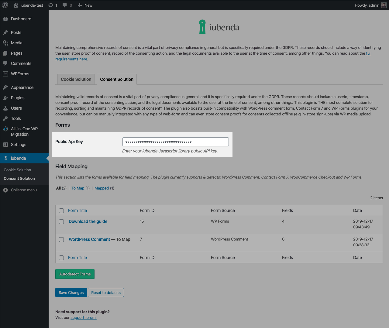 Selecione a tab Consent Database e insira a chave API Pública (você pode encontrá-la em seu dashboard da iubenda > [Seu site] > Consent Database > Integrar).