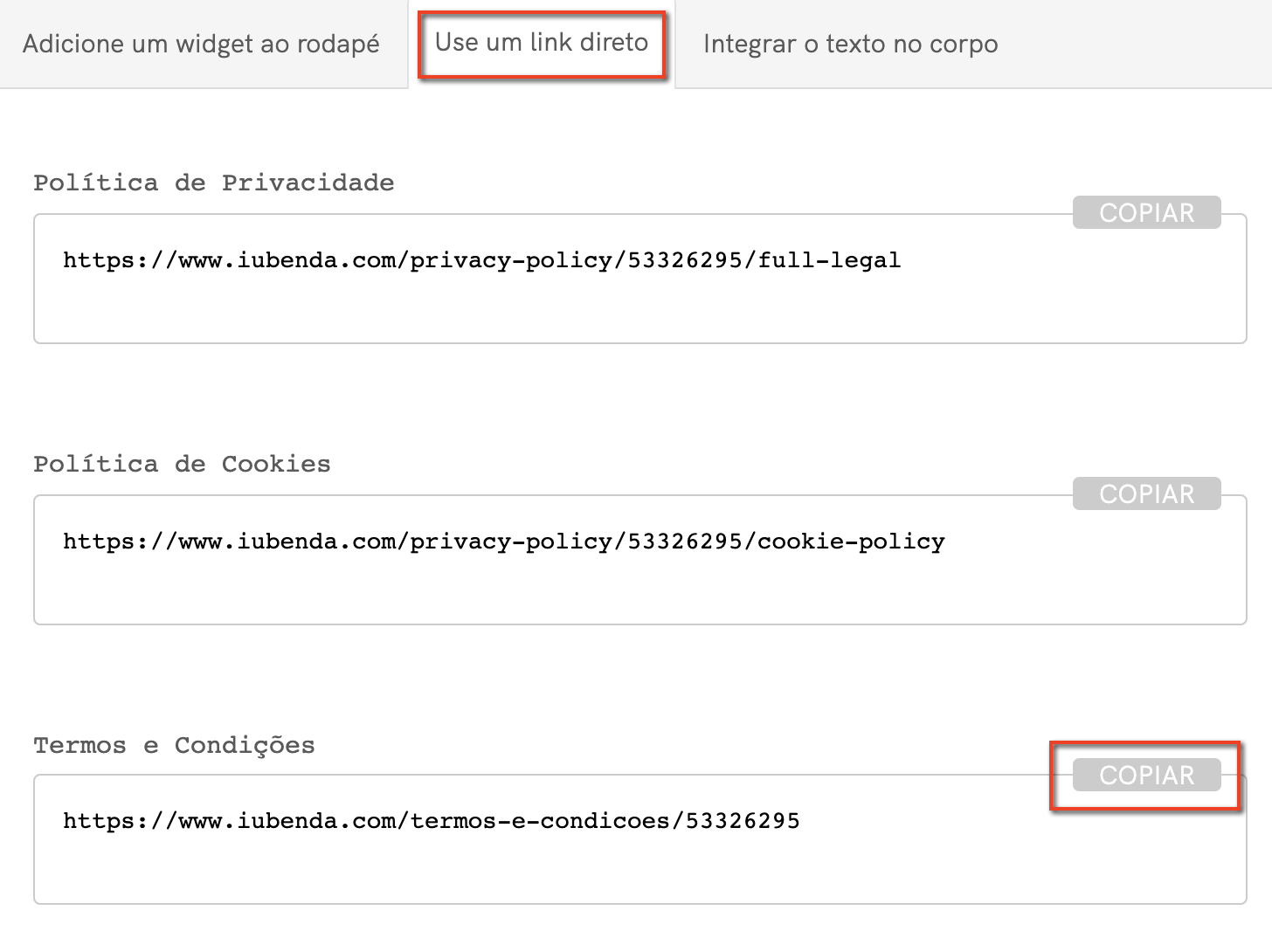 Para adicionar os seus Termos e Condições por meio de um link direto, em primeiro lugar, você precisa clicar em Usar um link direto e clicar em COPIAR na seção intitulada “Termos e Condições”