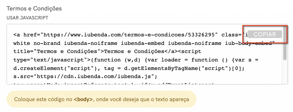 ⚠️ Observação: Ao seguir as instruções abaixo, você deve copiar o seu código iubenda. Não copie e use o código de amostra deste guia.