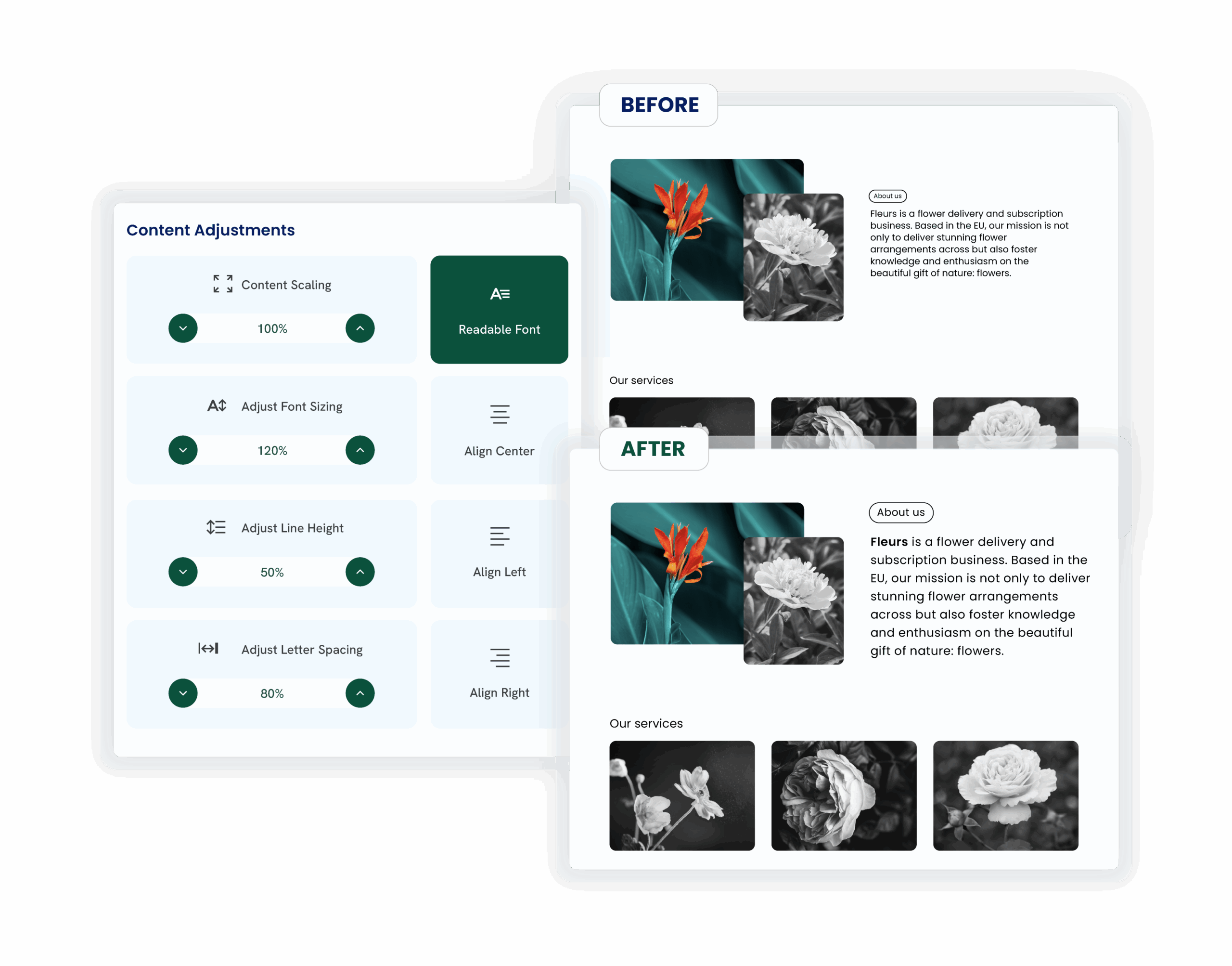 O WayWidget permite que os visitantes ajustem instantaneamente o tamanho, o espaçamento e o alinhamento, para que seu conteúdo seja legível para todos.