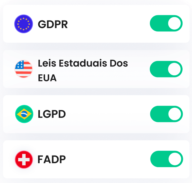Cobrimos todas as principais leis de privacidade globais, como o GDPR da UE/Reino Unido, a ePrivacy da UE (lei dos cookies da UE), a LGPD do Brasil, a FADP da Suíça e as leis estaduais dos EUA.