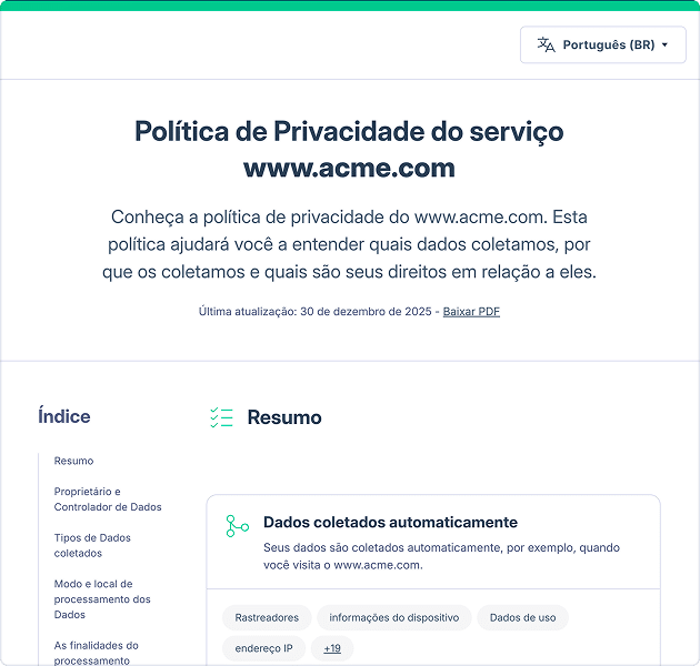 Cláusulas redigidas por advogados que fazem sentido para o seu site e serviços, sempre actualizadas para refletir os regulamentos mais recentes. Disponível em até 27 idiomas.