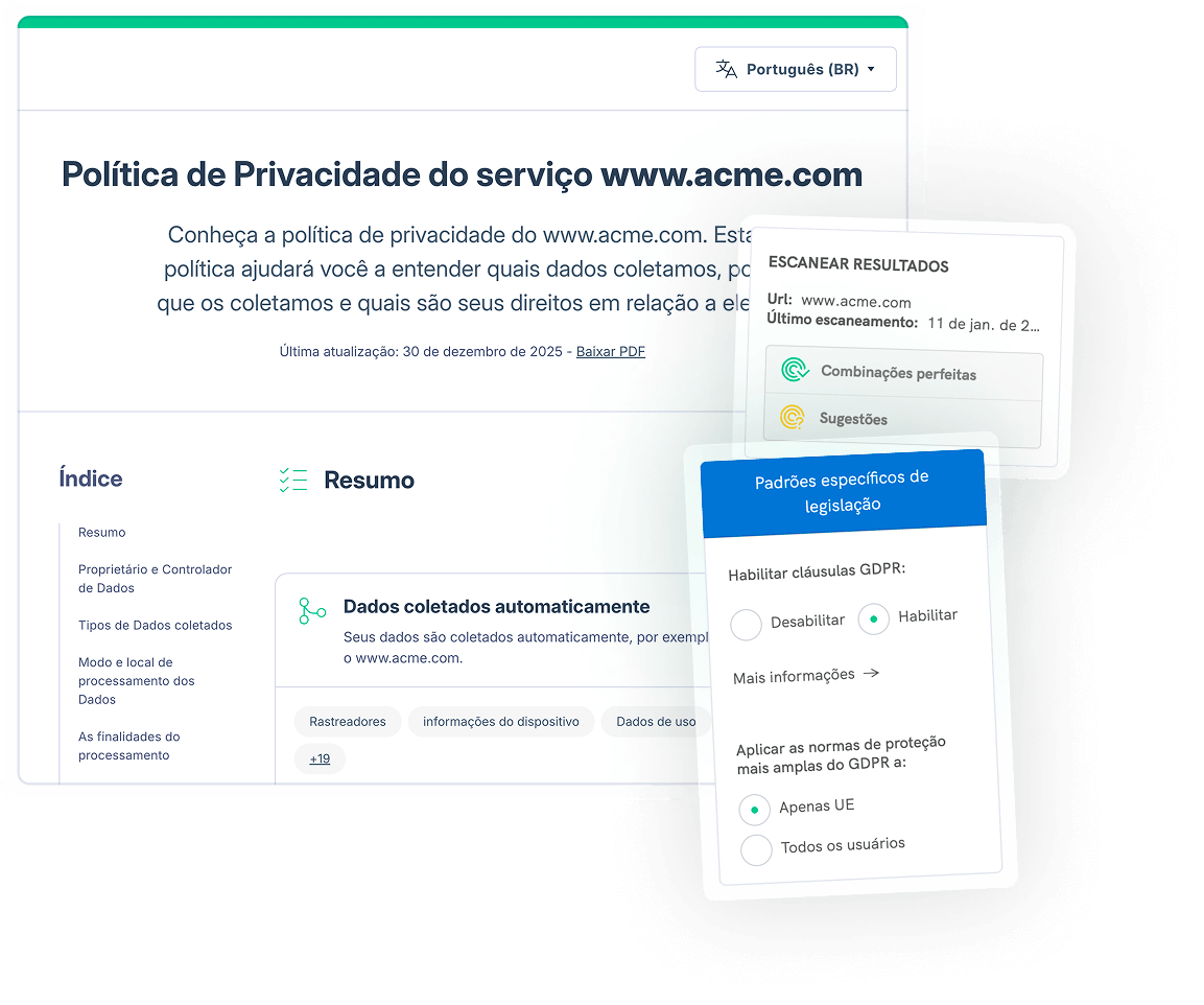 Prepare o seu site ou aplicação para cumprir o RGPD, a CCPA, a LGPD e outras leis globais de privacidade com uma solução tudo-em-um que inclui políticas de privacidade e cookies, banners de cookies e gestão de consentimento, termos e condições e acessibilidade. Crie confiança, melhore o desempenho e faça o seu negócio crescer.
