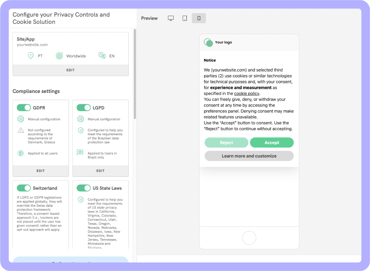 Nenhuma solução única pode prometer “conformidade para sempre”, mas a configuração correta torna possível provar a conformidade, e é aí que entra a iubenda.